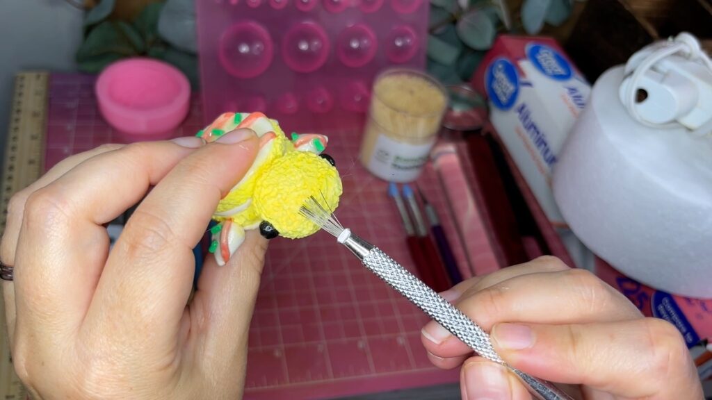 Those tools are perfect for shaping and sculpting. They are soft and slick so they can slide over the surface and smooth out any bumps. I also use those often to get into gaps that I cannot reach with my finger. They come in super handy to fix any gaps that may appear after the figure has dried. Just add some fresh clay of the same color into the gap and smooth out with the silicone tool. If you add a little bit of bag balm or petroleum jelly, you can slide over the surface without causing stretch marks. Watch me fix my axolotl that started having a gap here.
