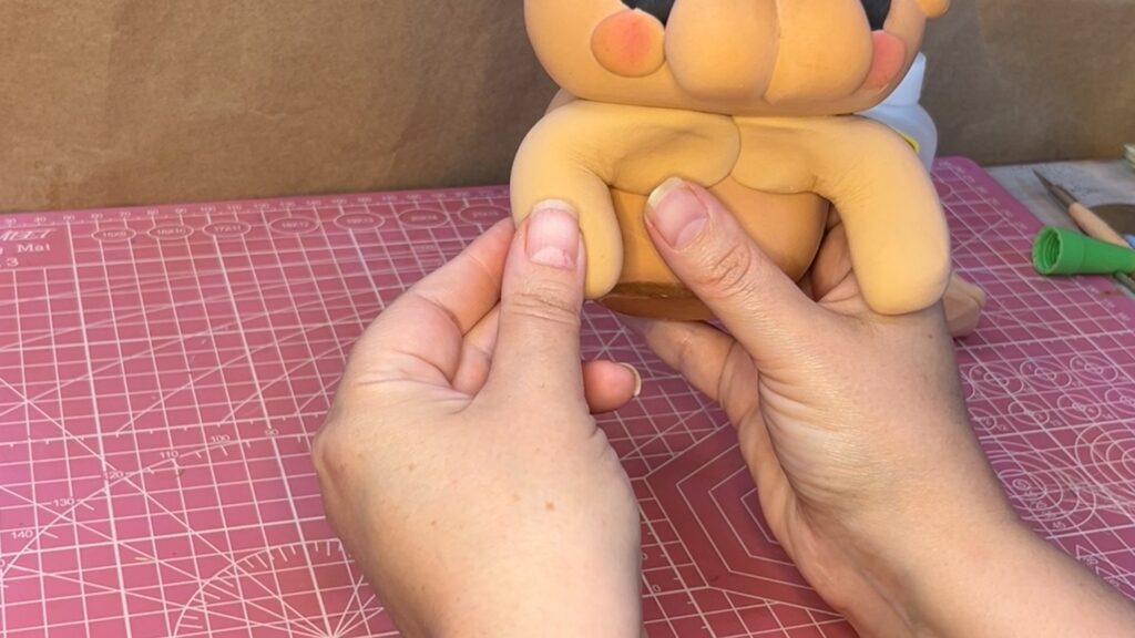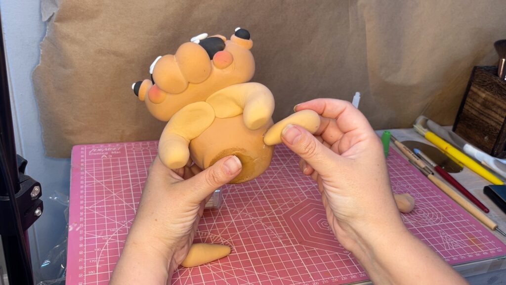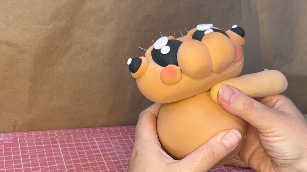 For the second set of legs, use a little less clay, about 3.5g. Shape them into teardrops, about 2 inches, and attach them the same way as the front legs.