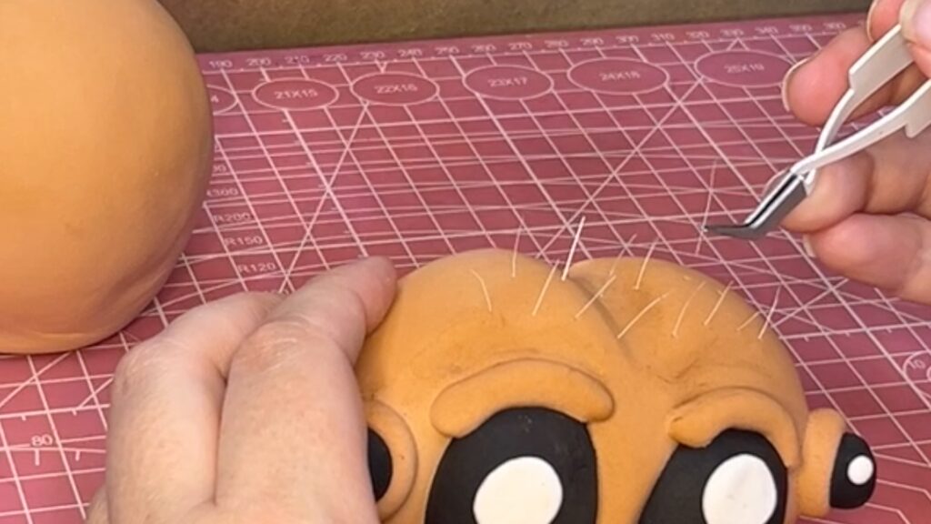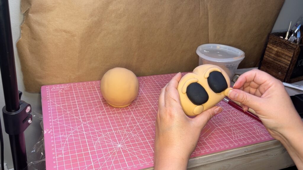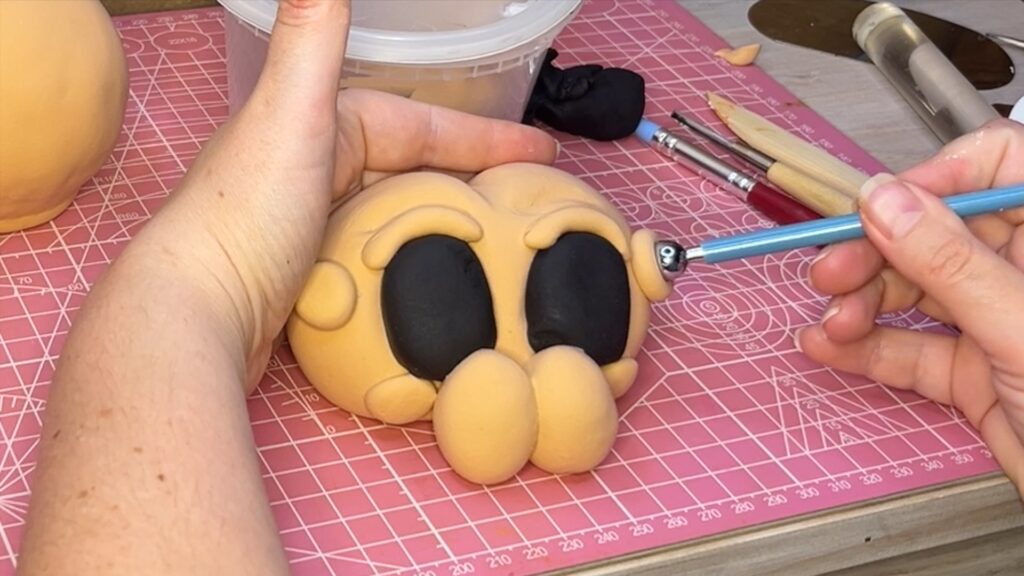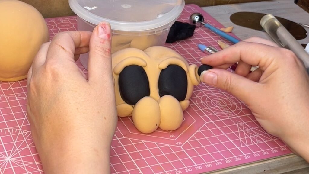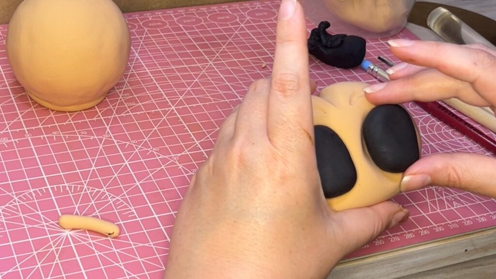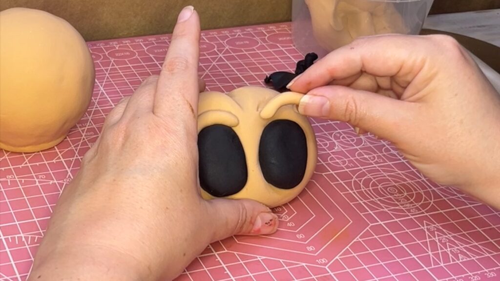 Take 4.2g black clay and shape two oval eyeballs. Insert them into the eye sockets. For the eyebrow, take 0.5g brown clay and shape it into a log. Place it above the eye.