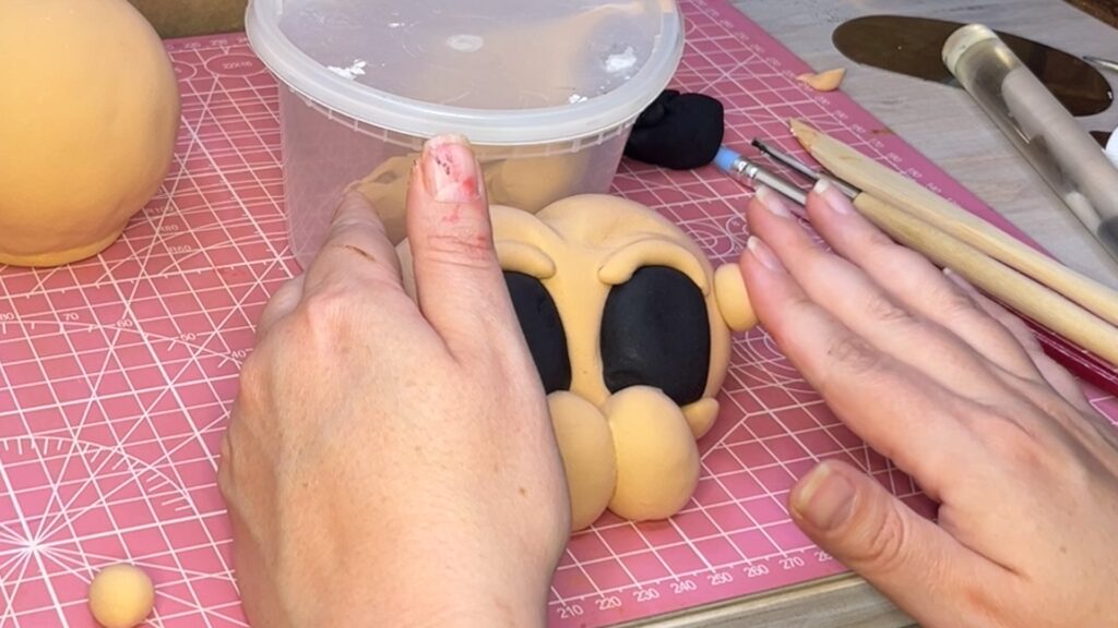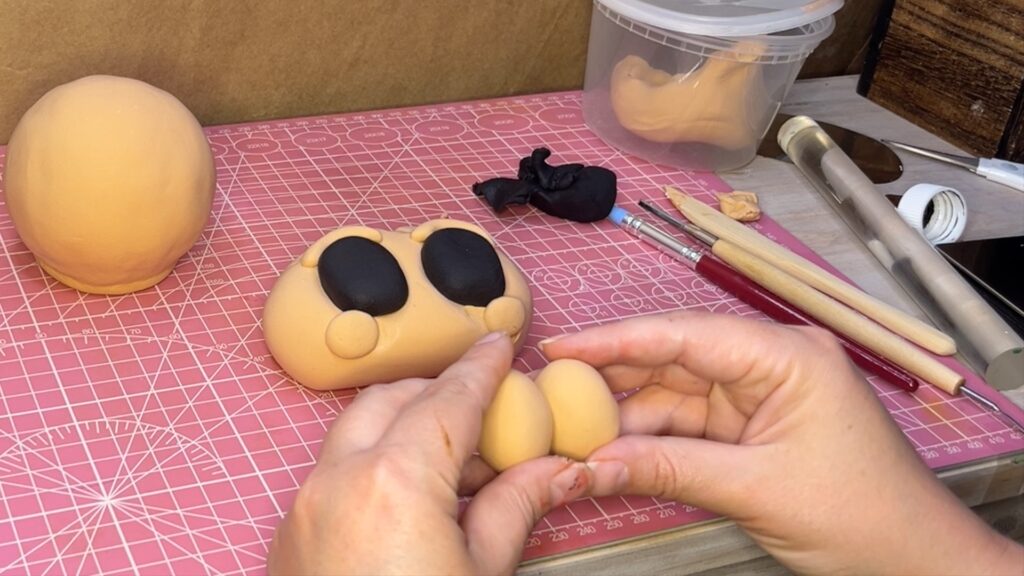Take 0.3g brown clay and shape two small balls. Press them under the eyes to sculpt the cheeks.