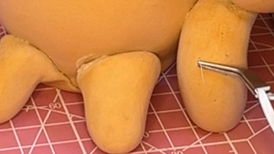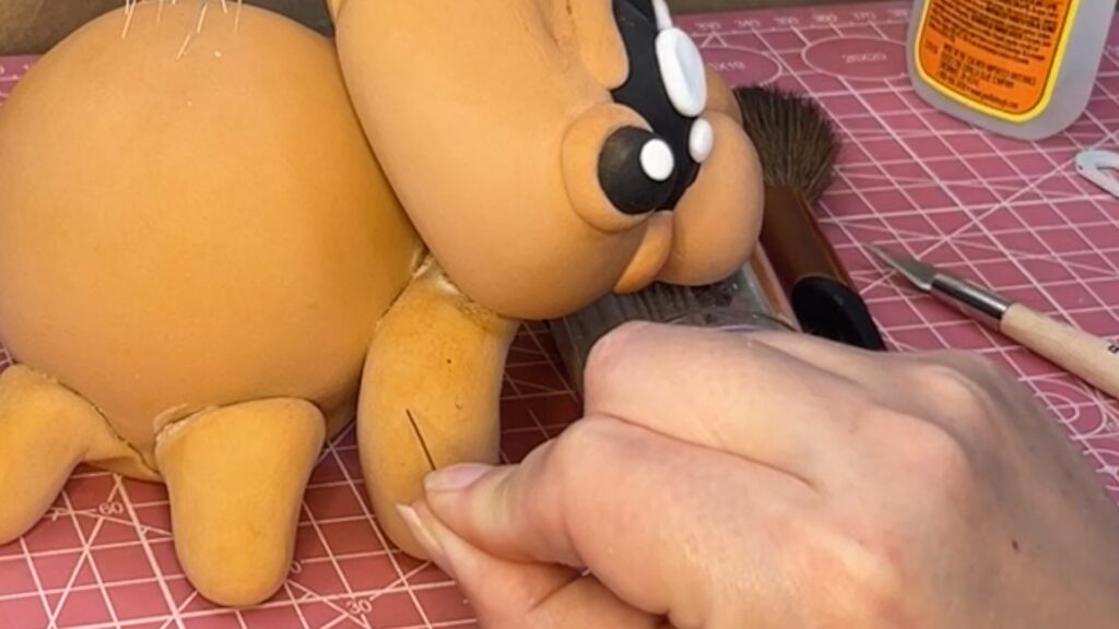 Cut some bristles from an old paintbrush. With a needle, create the hair shaft then insert the bristle. You can place more, of course—the more, the merrier. Add some to the head, the back, and the legs.