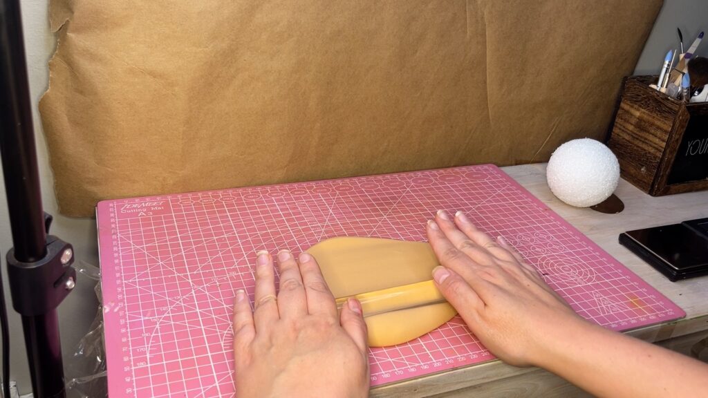 Roll out 70g of your brown clay. Go really slow when you see bubbles appear to let the air escape without them popping. Roll to about 1/8 of an inch.